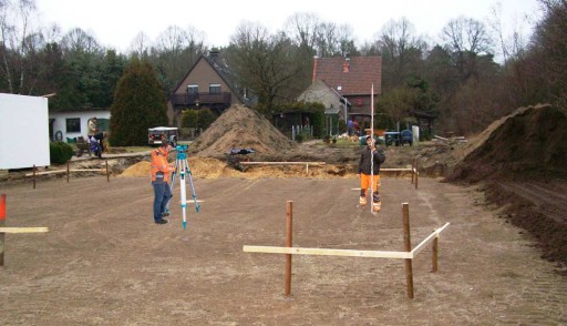 - Przygotowanie placu budowy: plantowanie terenu, grodzenie.: Pomiar i wyznaczenie rzędnych.