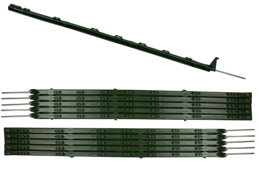 - słupki posiadają zaczepy blokujące drut, plecionki i taśmy o szerokości do 40 mm