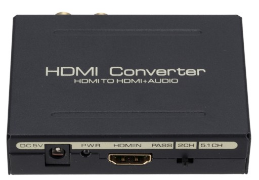 Extractor HDMI na HDMI + Audio (R/L+SPDIF) pozwala na podłączenie urządzenia wysyłającego sygnał audio i video (tuner, konsola, dvd, blu-ray) do telewizora kablem HDMI. Dodatkowo można wyodrębnić sygnał audio z urządzenia i przesłać go do amplitunera kina domowego lub innego tego typu urządzenia. Dzięki takiemu rozwiązaniu dźwięk będzie słyszalny standardowo z głośników telewizora i dodatkowo z drugiego źródła po włączeniu amplitunera. Ciekawe rozwiązanie gdy chcemy panować i sami decydować kiedy dźwięk ma być słyszalny z danego urządzenia.