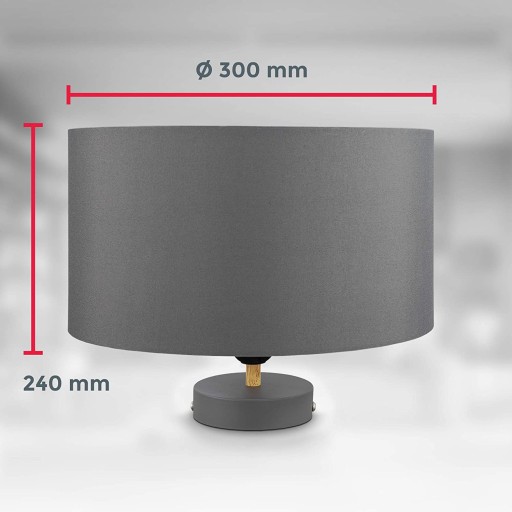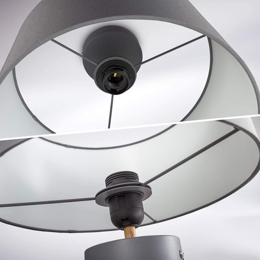- Lampa sufitowa wykonana z metalu w kolorze szarym oraz abażur z tkaniny w kolorze szarym.