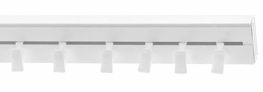 Standardowe upięcie stosowane do szyn pcv. Po wewnętrznej stronie żabki znajdują się ząbki, które zapobiegają wyślizgiwaniu się firan/zasłon.