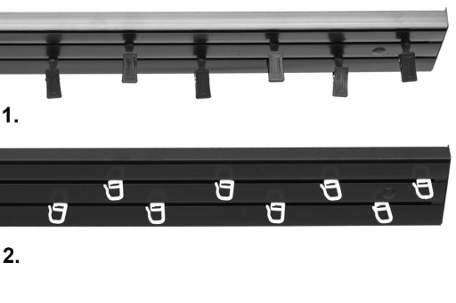 Upięcie jest bardzo podobne do agrafki z rolką, z tą różnicą, że agrafkę click nie trzeba wsuwać od końca karnisza, lecz możną ją wcisnąć w tor w dowolnym miejscu karnisza.