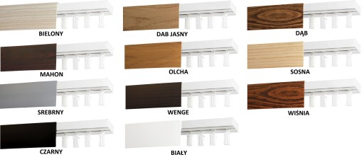 - karnisze sufitowe z maskownicą o szerokości 5 cm i 9 cm w rożnych kolorach (w tym drewnopodobne)