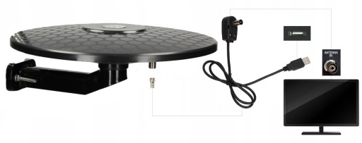 Antena DVB-T dostarczana jest wraz z końcówką typu F gotową do zamontowania na przewodzie koncentrycznym np. RG-6 (brak w zestawie). Antena wyposażona jest w przewód zakończony wtykiem USB który zapewnia prawidłowe funkcjonowanie wzmacniacza wbudowanego w antenie. Przewód koncentryczny należy prawidłowo zamontować wewnątrz wtyku zasilacza antenowego. Następnie należy podłączyć wtyczkę USB do wolnego gniazda w telewizorze a wtyczkę podłączyć do znajdującego się w odbiorniku telewizyjnym gniazda RF-IN (Antenna IN). Jeżeli Twój telewizor nie posiada wbudowanego tunera do odbioru cyfrowej telewizji naziemnej DVB-T / DVB-T antenę podłączamy w taki sam sposób do zewnętrznego tunera DVB-T / DVB-T2.