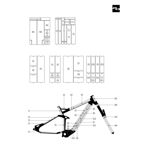 Mapa aplikacji/Instrukcja oklejania zawiera rozpisane i ponumerowane wszystkie elementy, które mają swoje konkretne przeznaczenie na Twoim rowerze.