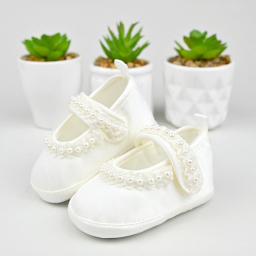 ECRU BUTY NA CHRZCINY Z OZDOBNYMI PEREŁKAMI ZAPINANE Z BOKU NA RZEPY