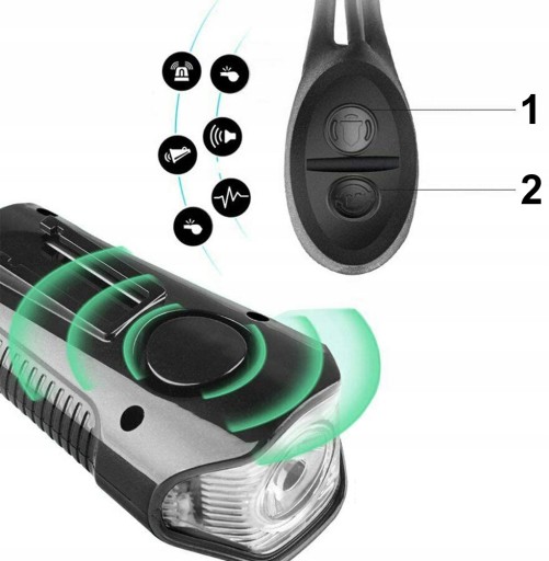 Nasze urządzenie posiada również w zestawie przewodowy przycisk do zamontowania na kierownicy umożliwiający sterowanie sygnałami dźwiękowymi odtwarzanymi z głośnika wbudowanego w lampkę.