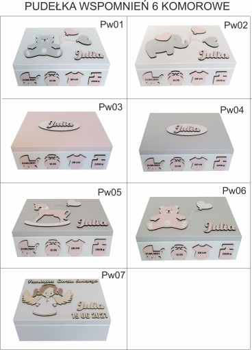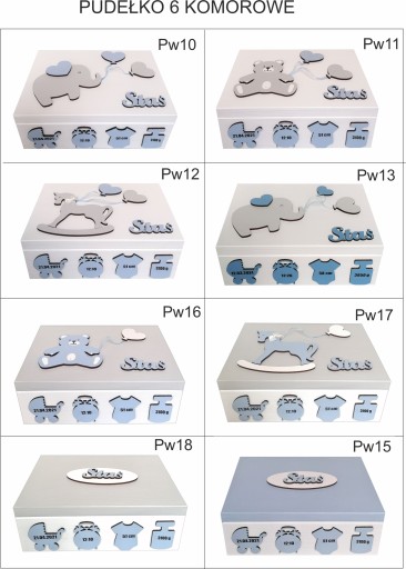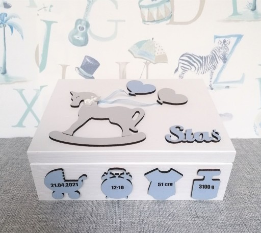 Na zewnętrznej ściance pudełka umieszczone zostało imię oraz metryczka z danymi dziecka.