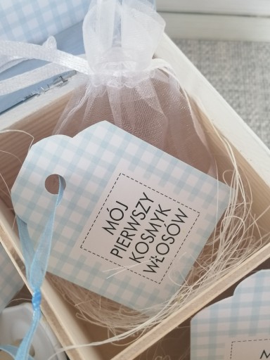 Dodatkowo w środku znajdują się 2 tiulowe, białe woreczki na pierwszy ząbek i pierwszy kosmyk włosów.