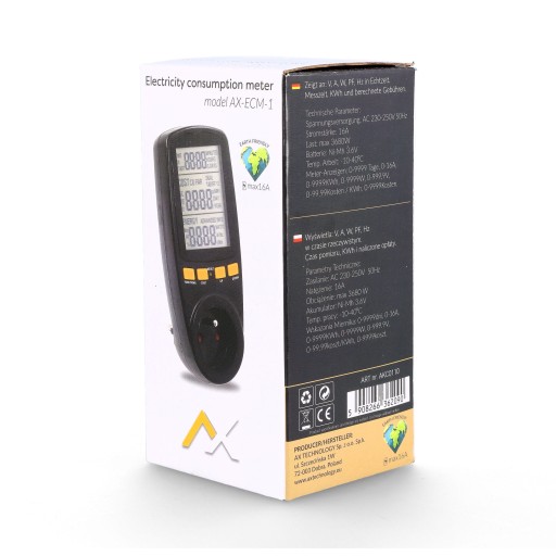 Urządzenie przeznaczone jest do pomiaru napięcia, natężenia oraz obciążenia prądu elektrycznego podłączonego urządzenia. Mierzy koszt zużytej energii (2 indywidualne taryfy). Duży wyświetlacz LCD zapewnia łatwą obsługę oraz czytelny i przejrzysty pomiar. Watomierz pozwala sprawdzić, które urządzenia działają nieekonomicznie - dzięki temu można wprowadzić plan oszczędzania i zredukować wydatki na prąd.Sprawdź ile energii zużywa Twój komputer, telewizor, pralka, ładowarka do telefonu, monitor czy grzejnik elektryczny lub suszarka do ubrań.Miernik mierzy pobieraną energię oraz oblicza jej koszt, podaje zużycie CO2 dla kontrolowanych urządzeń.Wewnętrzny akumulator Ni-Mh 3,6V podtrzymuje ustawienia urządzenia w razie braku prądu.
