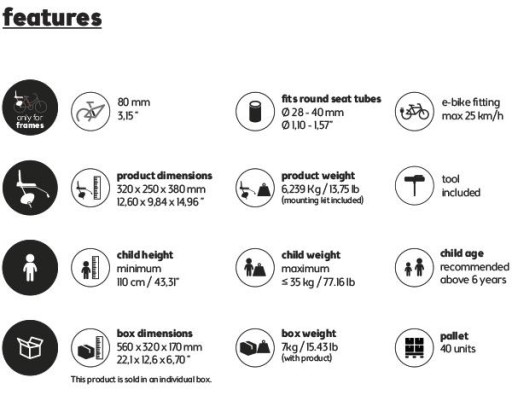 Bobike Classic Junior Plus jest dostarczany z osprzętem montażowym do mocowania na ramie roweru. Mocowanie to pasuje do okrągłych rur o średnicy 28-40 mm i wymaga 80 mm miejsca na rurę. Pasuje do rowerów 28" i 26". Jeśli rower posiada bagażnik, szerokość bagażnika nie może przekraczać 160 mm.