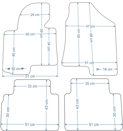Poniżej wymiary dywaników oraz rodzaj zamontowanych stoperów.