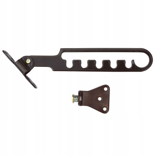 Przytrzymywacz okienny wykonany z metalu malowanego proszkowo na brązowo.