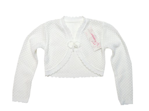 prześliczne bolerko ażurkowe, idealne do sukieneczki, doskonałe na wyjątkowe okazje, bolerko w śnieżnobiałym kolorze, dekorowane kwiatuszkami, wiązane na sznureczki, wykonane z najwyższej jakości certyfikowanej przędzy, charakteryzuje się wysoką jakością wykonania oraz dużą wytrzymałością, jest przy tym mięciutkie i miłe w dotyku