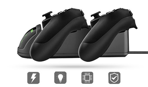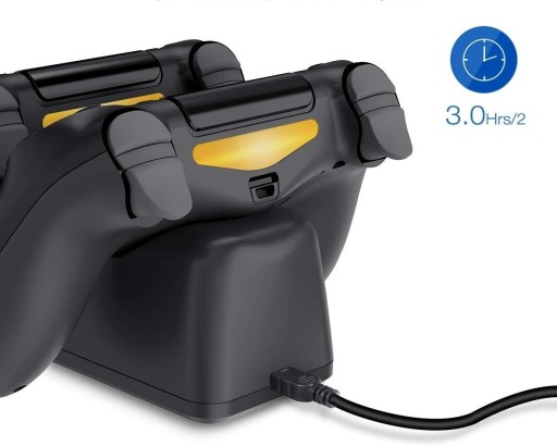 Stacja dokująca pozwala błyskawicznie naładować 2 pady równocześnie! Ze względu na unikalną konstrukcję ładowarka zajmuje niewiele miejsca a ładowanie kontrolerów przebiega w łatwy i szybki sposób. Wystarczy osadzić pady w slotach i podłączyć ładowarkę do zasilania przy pomocy dołączonego do zestawu kabla USB. Umożliwia równoczesne ładowanie 1 lub 2 padów do konsoli PS4.