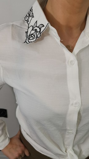 Nietuzinkowa koszula z ozdobnym zdobieniem na kołnierzyku.