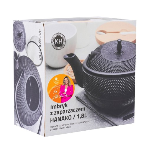 Czarny imbryk do herbaty z zaparzaczem Konighoffer Hanako 1,8 l wykonany jest z żeliwa. W zestawie znajduje się również nierdzewny zaparzacz. Dzięki niemu oddzielisz susz od wrzątku i sprawnie poradzisz sobie z przerwaniem procesu parzenia esencji. Wnętrze czajniczka wykończono nietoksyczną emalią w kolorze czarny. Ułatwi ci ona pielęgnację i zadba o walory naparu. Model długo trzyma ciepło. Możesz ustawić go na podgrzewaczu (do 60 minut!). Duża rączka imbryka ułatwia jego przenoszenie, a także nalewanie herbaty do kubków i filiżanek. Pokrywka korpusu umożliwia wydajną regulację pary wewnątrz. Produkt ma rekomendację Ewy Wachowicz. Jako ambasadorka marki Konighoffer, gorąco i z uśmiechem poleca go ona do domowego użytku. Razem z nim zdobędziesz twój przepis na dom. To jedna z najlepszych opcji w tej kategorii!