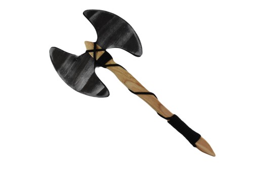 Drewniany topór podwójny z rękojeścią oplecioną sznurkiem dla mocniejszego i wygodniejszego uchwytu. Długość ok. 45cm.