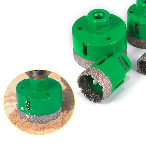 Wiertła diamentowe do szkła mają również otwory w korpusie, dzięki czemu opiłki można skutecznie usuwać, podczas gdy ostrza obracają się z dużą prędkością.