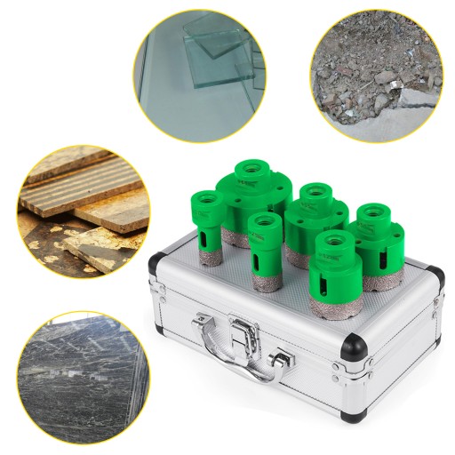 Ten zupełnie nowy zestaw profesjonalnych wierteł diamentowych o średnicach 20/25/40/45/50/68 mm (0.79/1/1.6/1.8/2/2.7 cala) i gwintach M14 zapewnia szybkie, proste i czyste skaleczenie. Brak potrzeby wody pozostawia miejsce pracy w czystości.