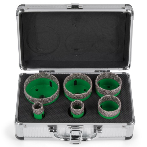 W zestawie znajduje się 6 bitów o średnicy 68 mm, 50 mm, 45 mm, 40 mm, 25 mm, 20 mm, które mogą wiercić otwory o różnych rozmiarach w zależności od potrzeb.