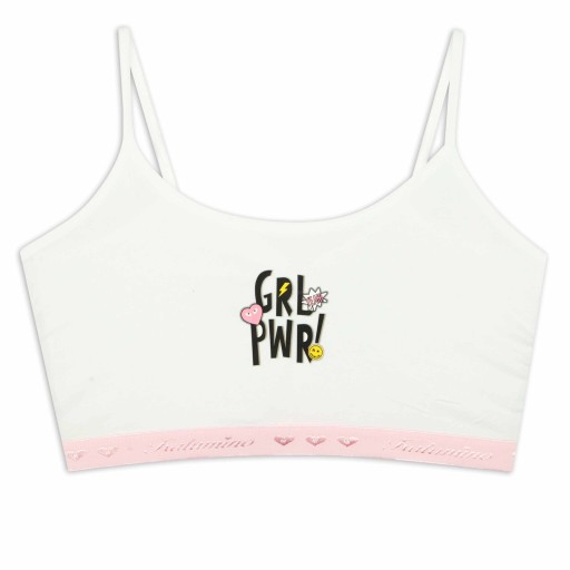 W skład kompletu wchodzi biustonosz oraz majtki bokserki w kolorze białym z delikatnym nadrukiem. Staniczek posiada efektowną gumkę pod biustem.