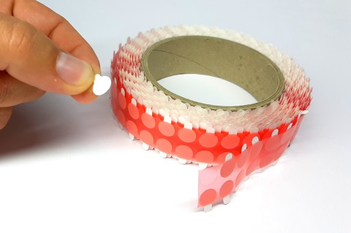 Bezbarwne kółka dwustronnie klejące wyposażone są w specjalny języczek ułatwiający aplikację BEZ DOTYKANIA KLEJU