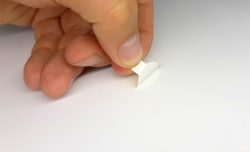 - Cały czas trzymając za listek naklej kółko na pożądaną powierzchnię. Mocno dociśnij kółko do powierzchni