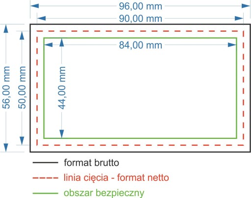 - format brutto (netto + spad)– rozmiar jaki musi mieć plik przesyłany do wydruku. Do tego rozmiaru należy wyciągnąć tło i grafiki/zdjęcia, które po przycięciu będą dochodzić do krawędzi wizytówki.