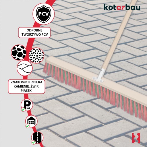 Miotła uliczna KOTARBAU znajduje zastosowanie podczas zamiatania dróg, placów, parkingów, chodników, pojazdów, magazynów, zakładów produkcyjnych, ale również w gospodarstwach domowych, ogrodach i warsztatach. Szczotka jest wykonana z PCV i charakteryzuje się wyjątkową trwałością i odpowiednim rozmiarem. Nadaje się do zamiatania piasku, kamieni, żwiru, błota i błota.