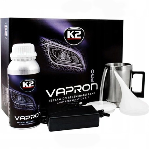 K2 Vapron to profesjonalny zestaw do regeneracji i zabezpieczenia zniszczonych lamp, popularnie nazywany „czajniczkiem do reflektorów” lub „magicznym czajniczkiem”. Doskonale nadaje się do odnawiania zniszczonych (zmatowiałych, pożółkłych) reflektorów, niezależnie od wieku samochodu i stopnia zniszczenia lamp.