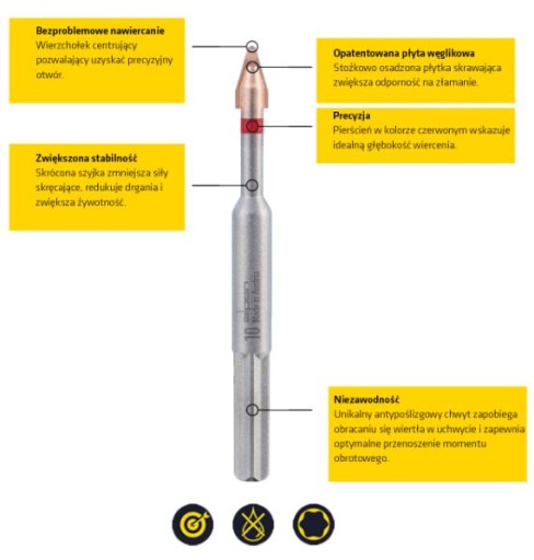 ?Unikalny, antypoślizgowy chwyt zapobiega obracaniu się wiertła w uchwycie i zapewnia optymalne przenoszenie momentu obrotowego.