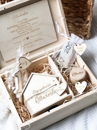 Drewniane pudełko wspomnień z przegródkami jako wyjątkowy prezent na chrzest, roczek lub inną okazję.