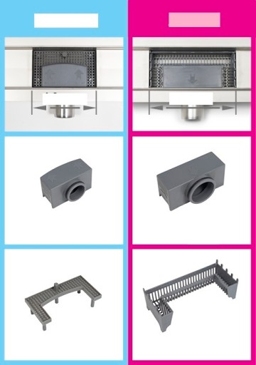 Kompletny do montażu zestaw niskiego odpływu liniowego z dwustronnym panelem, głębokim osadnikiem i powiększonym syfonem firmy Balneo.