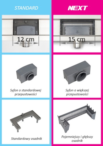 W odpływach liniowych BALNEO z serii NEXT powiększona została stalowa komora do 15 cm w porównaniu z odpływami powszechnie występujących na rynku 12 cm, co pozwoliło na zainstalowanie szerszego syfonu. Rozwiązanie to sprawia, że przepustowość odpływu została zwiększona z 49l /min (STANDARD) do 55l/min (NEXT).