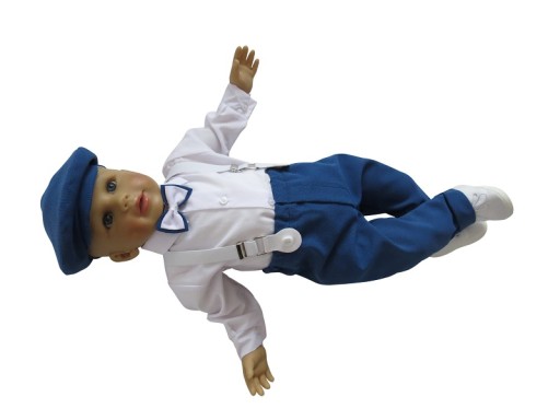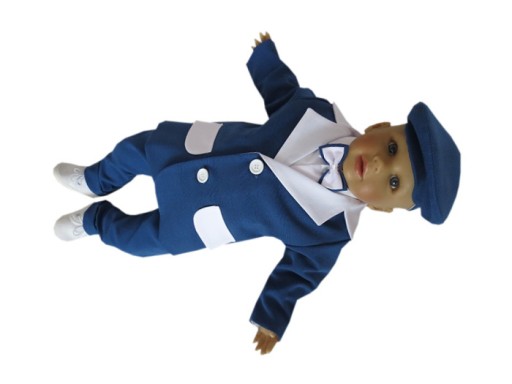 - MARYNARKA NIEBIESKA Z BIAŁYMI ELEMENTAMI- USZYTA Z TKANINY GARNITUROWEJ. ZAPINANA NA GUZICZKI, PODSZYTA PODSZEWKĄ.