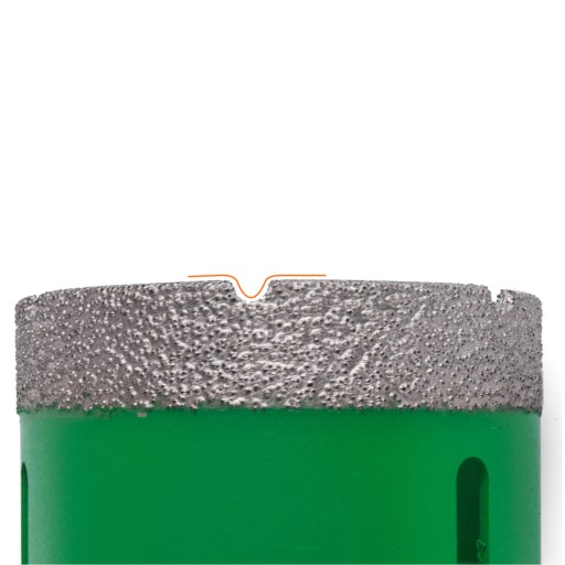 Zestaw wierteł diamentowych do otwornic ma małe szczeliny na obręczy, zaprojektowane pod kątem mniejszego tarcia oraz płynniejszego i szybszego cięcia.