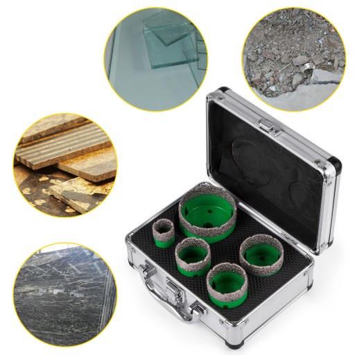 W zestawie znajduje się 5 bitów o średnicy 68 mm, 50 mm, 45 mm, 40 mm, 25 mm, które mogą wiercić otwory o różnych rozmiarach w zależności od potrzeb.