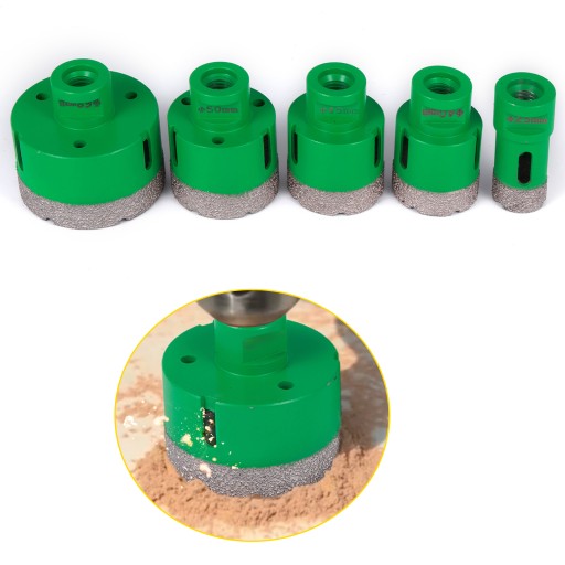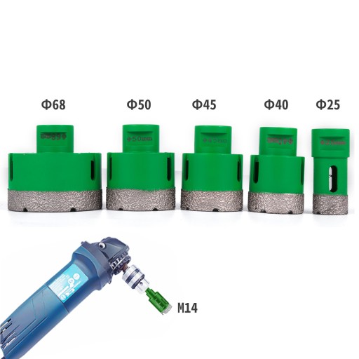 Ten zupełnie nowy profesjonalny zestaw wierteł diamentowych o średnicach 25/40/45/50/68 mm (1 / 1,6 / 1,8 / 2 / 2,7 cala) i gwintach M14 zapewnia szybkie, łatwe i łatwe czyszczenie. Do opuszczenia miejsca pracy nie jest potrzebna woda.