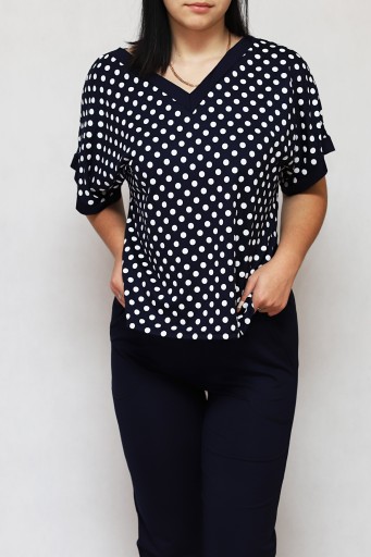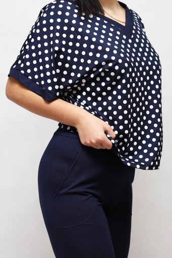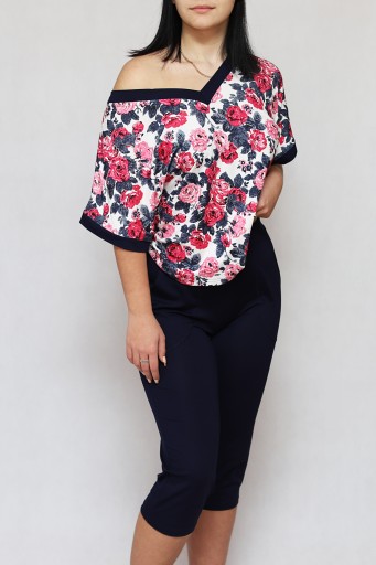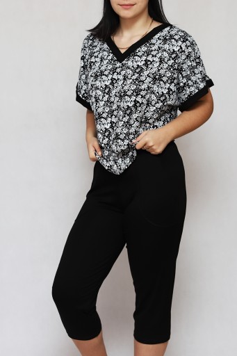 Koszulka o luźnym kimonowym kroju, pod szyjką w serek. Spodnie długości 3/4, z kieszeniami, w pasie gumka.