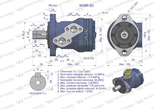 Silnik hydrauliczny orbitalny WMR 50 cm³/obr (140 bar / max.175 bar / max.chwilowe 200 bar) Waryński.