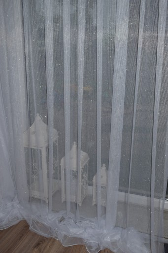 Firanka bardzo ekskluzywna w kolorze bieli ( ultra bieli ) raczej zimny odcień bieli, rzekłabym biel typowa dla tkanin pochodzenia tureckiego. Firanka przepięknie połyskuje, mieni się, iskrzy za sprawą MESZKU jaki na sobie posiada