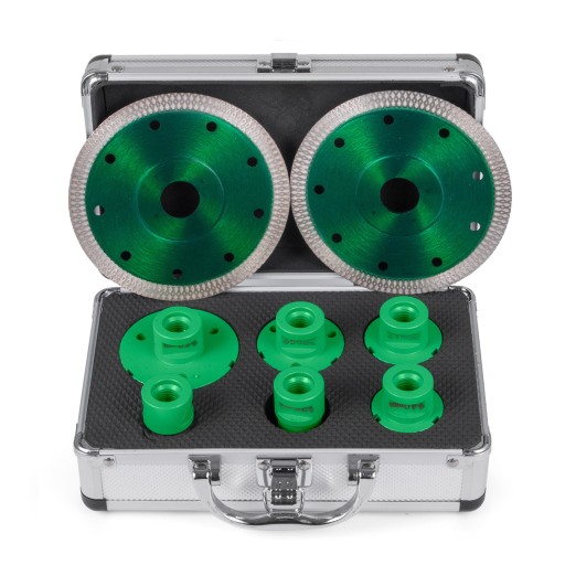 Zestaw wierteł diamentowych ma małe szczeliny na obręczy, zaprojektowane z myślą o mniejszym tarciu i płynniejszych, szybszych cięciach.
