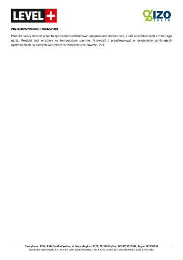 Produkt należy chronić przed bezpośrednim oddziaływaniem promieni słonecznych, z dala od źródeł ciepła i otwartego ognia. Produkt jest wrażliwy na temperatury ujemne. Przewozić i przechowywać w oryginalnie zamkniętych opakowaniach, w suchych warunkach w temperaturze powyżej +5°C.
