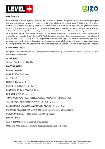 Produkt należy nakładać pędzlem, wałkiem, pacą stalową lub metodą natryskową. Prace należy wykonywać przy temperaturze podłoża i otoczenia od +5°C do +25°C. Czas schnięcia jednej warstwy od 6 do 24 godzin. Nie należy nakładać jednorazowo zbyt grubej warstwy folii, nadmiar należy natychmiast usunąć. Nałożenie jednorazowo zbyt dużej ilości folii wydłuża czas wiązania oraz może spowodować skurcz powłoki a w efekcie spękania. Kolejne warstwy należy nakładać prostopadle do warstwy poprzedniej (metoda krzyżowa). W zależności od typu i przeznaczenia zabezpieczanej powierzchni należy pamiętać o stosowaniu systemowych uszczelniających taśm, mankietów i narożników oraz sznurów dylatacyjnych LEVEL PLUS. Ostateczne zużycie produktu oraz czas schnięcia zależy od jakości (porowatości) podłoża i należy je ustalić na podstawie indywidualnych prób dla danego zastosowania na różnych rodzajach podłoża. Dalsze prace budowlane należy prowadzić po wyschnięciu wszystkich warstw. W przypadku prac na zewnątrz chronić izolowaną powierzchnię przed nasłonecznieniem, wiatrem, opadami atmosferycznymi i mrozem.