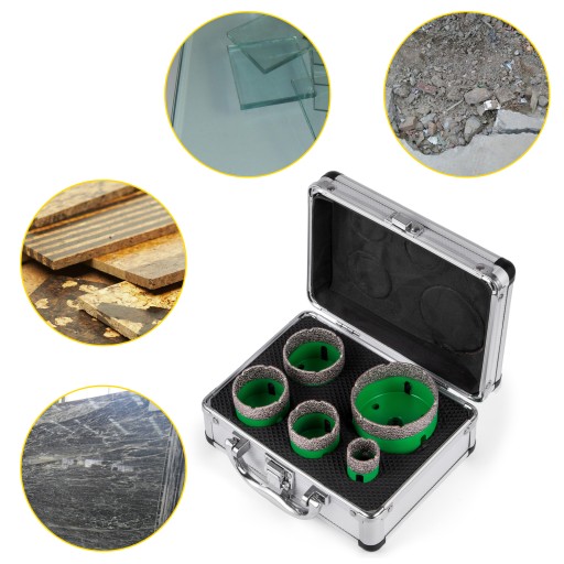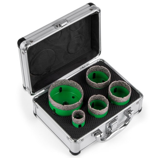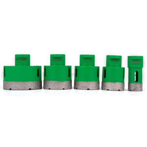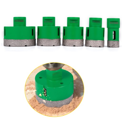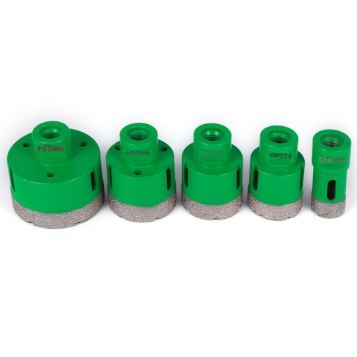 Ten zupełnie nowy zestaw profesjonalnych wierteł diamentowych o średnicach 22/35/40/50/65 mm (0,87/1,4/1,6/2/2,5 cala) i gwintach M14 zapewnia szybkie, proste i czyste cięcie. Brak potrzeby wody pozostawia miejsce pracy w czystości.