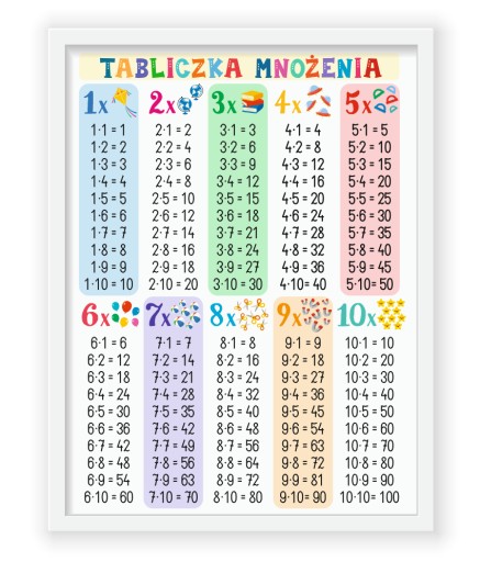 Plakat edukacyjny z tabliczką mnożenia oprawiony w białą ramkę. Idealny dla dzieci w wieku szkolnym.