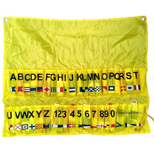Zestaw zawierający 40 flag sygnałowych służących do porozumiewania się załogom statków za pomocą kodu flagowego MKS. Każda flaga posiada osobną kieszonkę w pokrowcu, który dzięki otworom można zawiesić na ścianie
