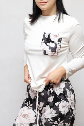 Koszulka gładka, z długim rękawkiem, pod szyjką wykończona ściągaczem. Do ozdoby na piersi podwójna, praktyczna kieszonka.