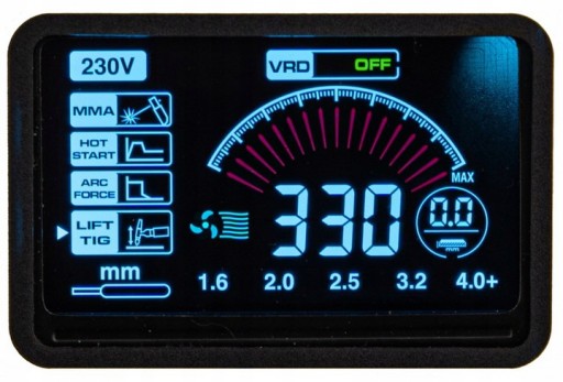 Urządzenie spawa prądem od 30 do 330A, pozwala na spawanie elektrodą o średnicy 1,6mm do 4mm. Waga spawarki to jedynie 3,5kg dzięki czemu jest ona bardzo poręczna. Posiada również pasek nośny ułatwiający pracę na wysokościach.
